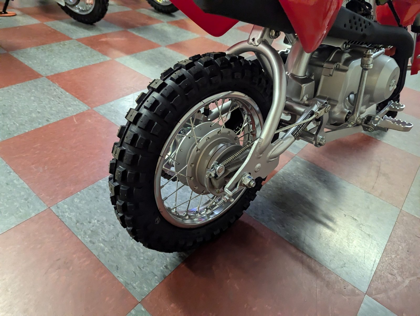 The CRF50F’s steel frame and durable plastic bodywork are engineered to handle the bumps, scrapes, and spills that come with off-road fun. Its steel wheels and 2.50-10 knobby tires deliver reliable grip across dirt, gravel, and grass, providing traction and control on every surface.